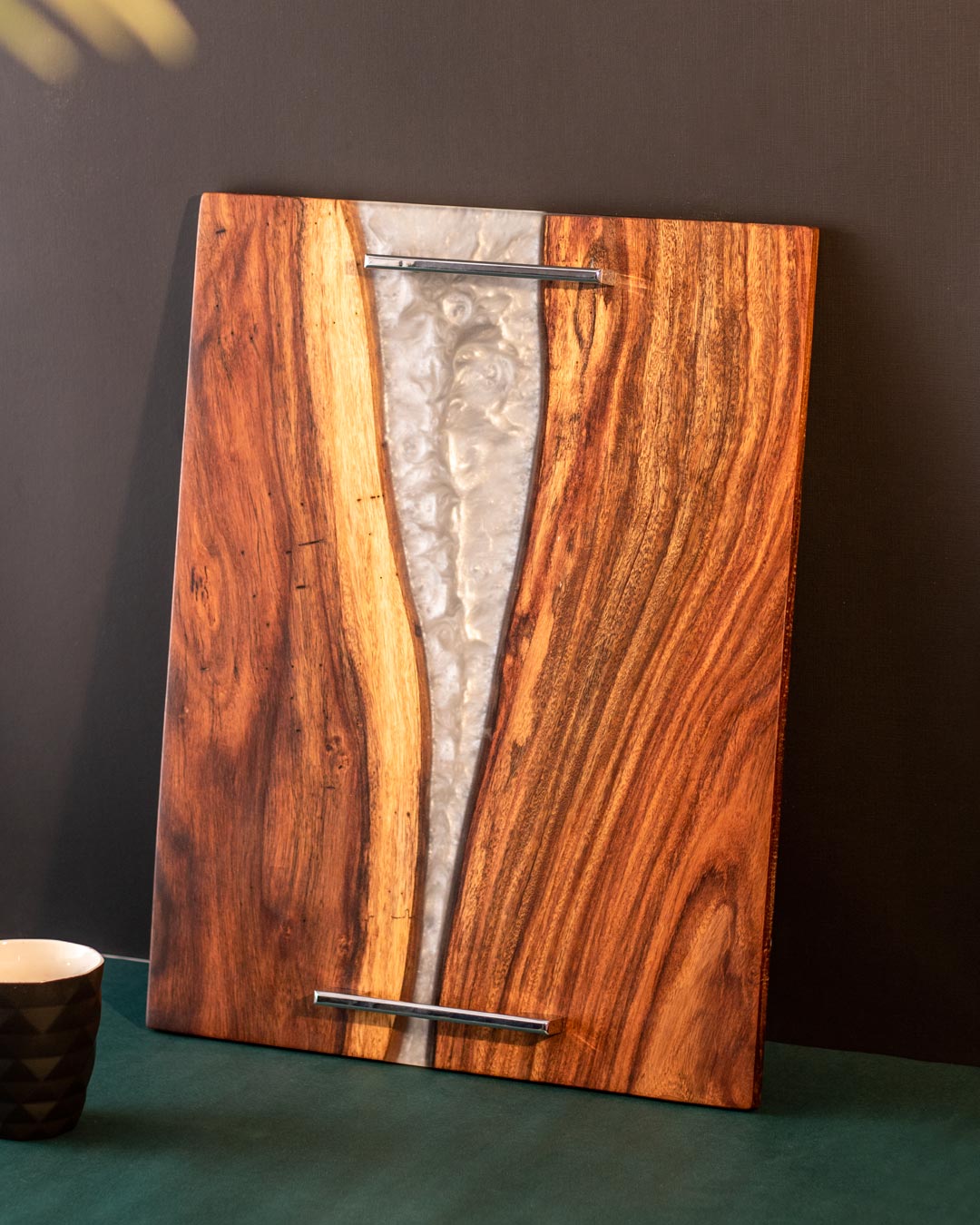 African rose wood blended with matt pearl resin. A masterpiece chess platter tray, indeed.