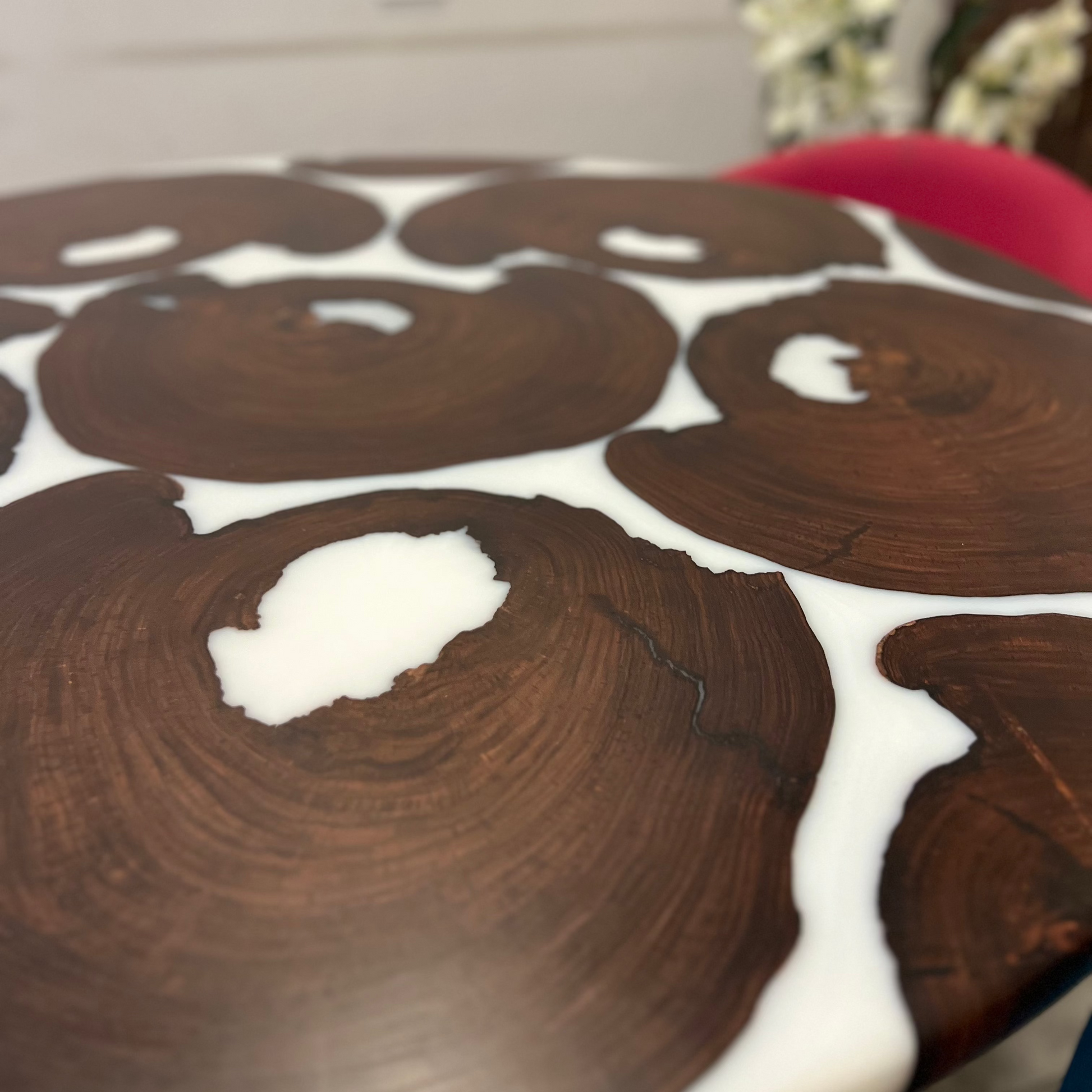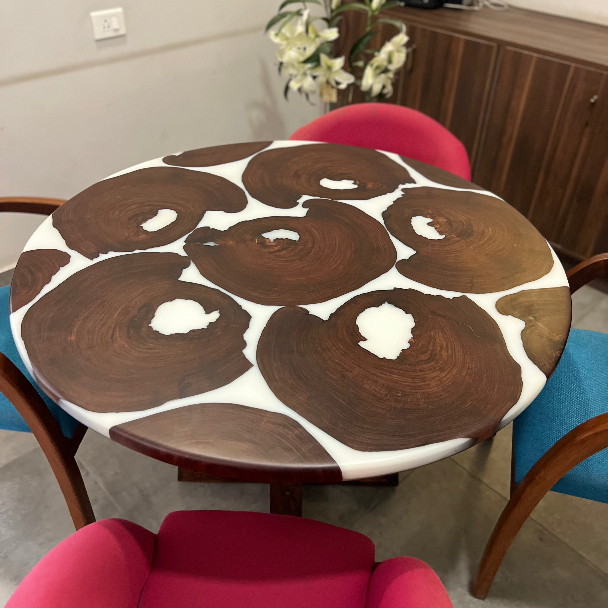 This handcrafted centre table draws its bold, circular design and layered detailing straight from the world’s most loved cookie — the Oreo. The deep, rich tones of natural wood replicate the iconic dark biscuit, while a creamy resin core runs through the centre, representing the soft filling we all crave.